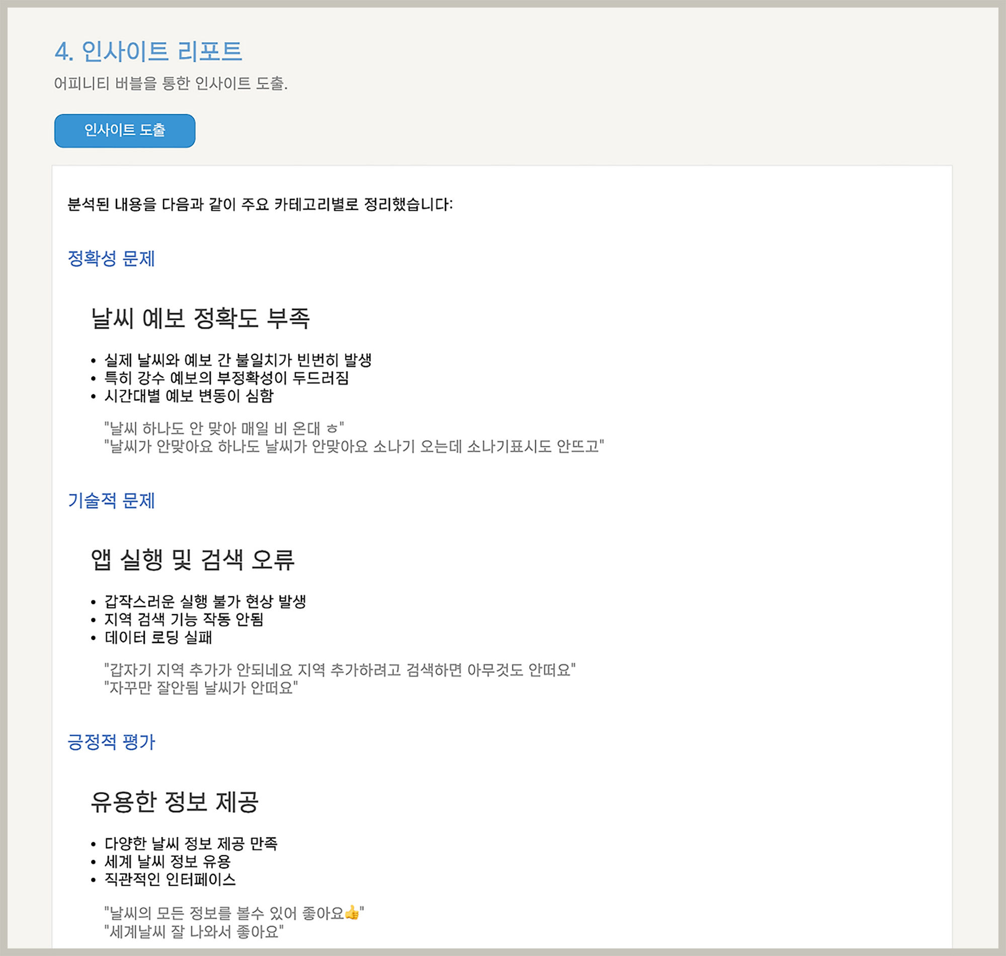 어피니티 버블로 클러스터링 된 내용을 기반으로 핵심 발견 사항 형식의 간단한 리포트를 제공합니다. 핵심 사항과 그에 해당하는 사용자 목소리를 예시로 함께 보여줍니다.