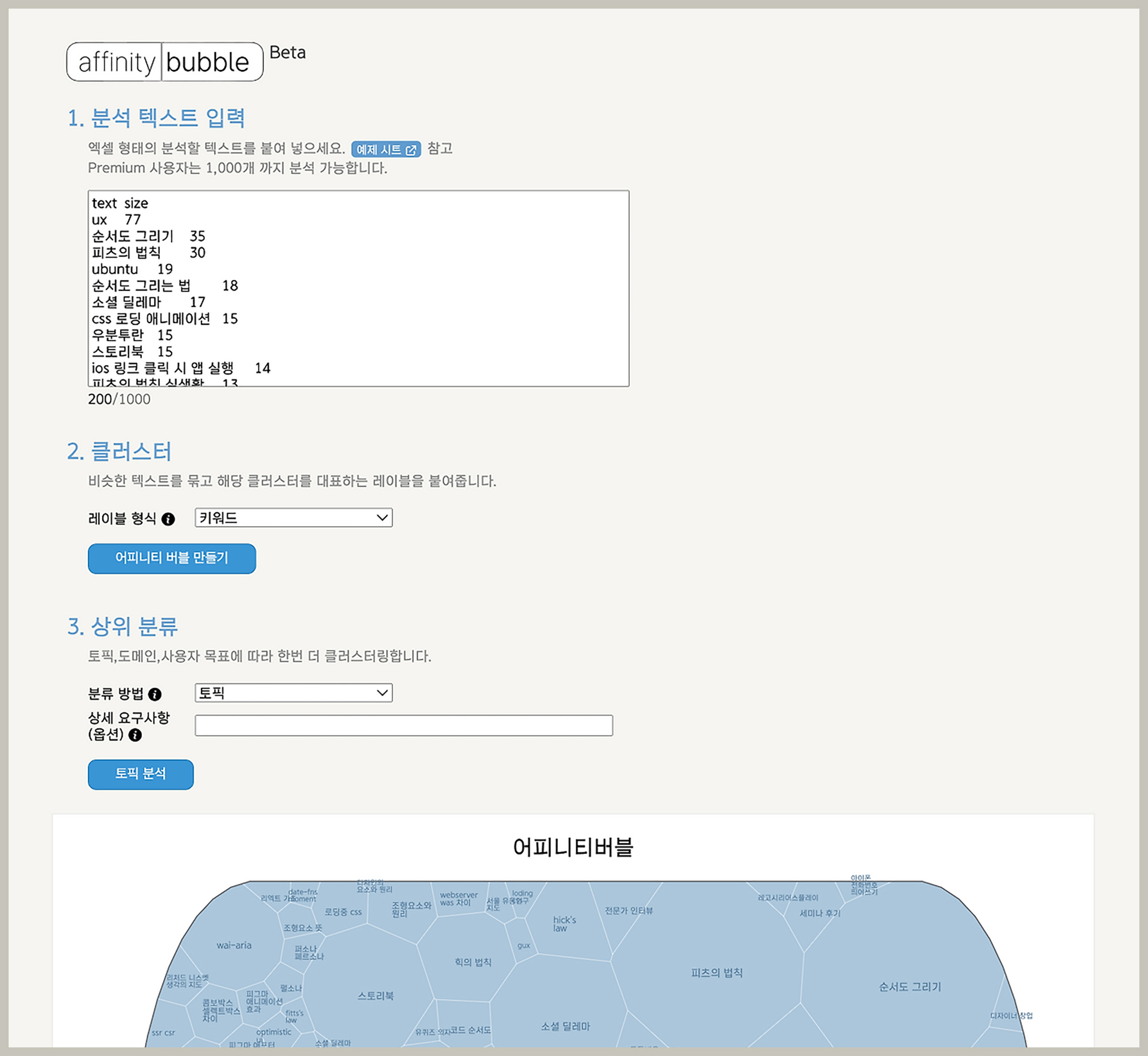 텍스트 데이터를 넣으면 바로 다이어그램이 만들어지는데 비슷한 내용들을 그룹핑하고 레이블을 추출하면서 어피니티가 버블 형태로 나타납니다.