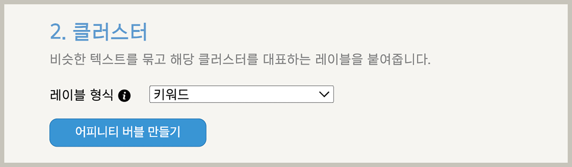 [어피니티 버블 만들기] 버튼을 누르면 1차 클러스터링 작업을 합니다. 텍스트 임베딩을 하고, 벡터 유사도에 따라 비슷한 내용을 모아 클러스터링하고, 각 클러스터를 대표하는 레이블을 만드는 작업을 순차적으로 진행하는데요. 레이블을 단순 키워드 형식으로 할지 사용자 목소리 형식으로 할지 선택할 수 있습니다. 사용자 인터뷰나 앱 리뷰 같은 텍스트인 경우에 사용자 목소리 형식으로 하면 내용을 이해 쉽습니다.