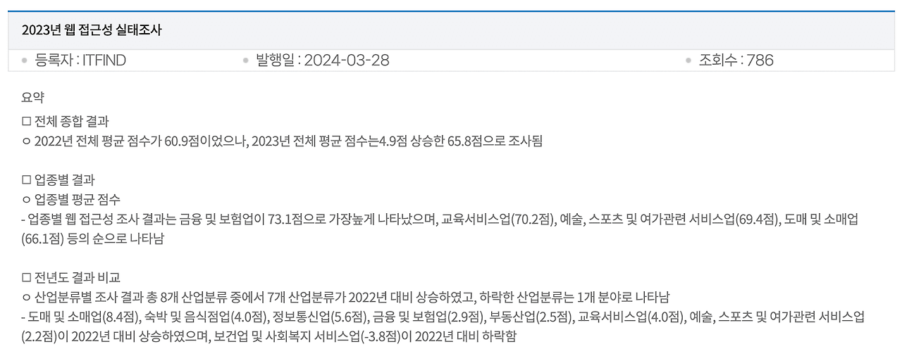 2022년 대비 평균 점수가 60.9점에서 65.8점으로 상승했지만, 웹 접근성이 의무 사항임을 감안할 때 여전히 부족한 점수라고 할 수 있습니다.