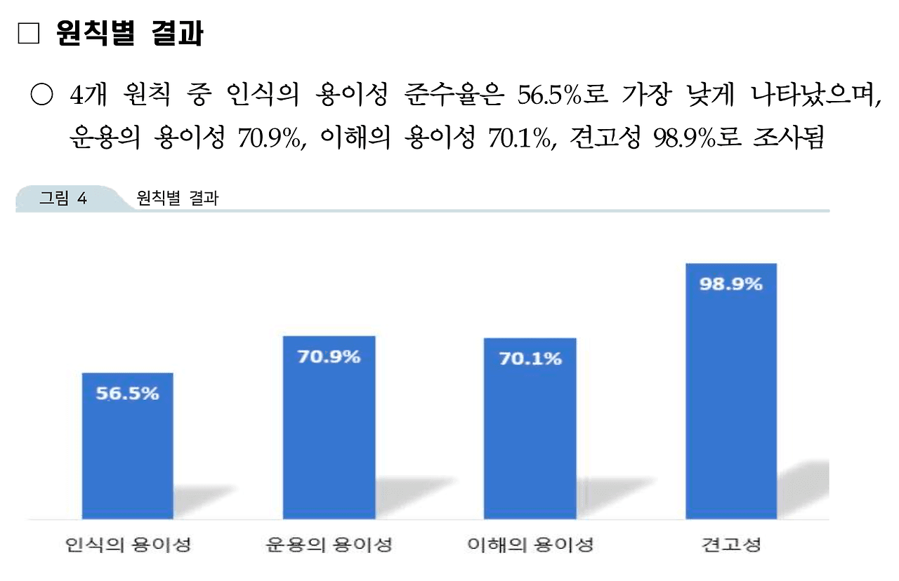 웹 접근성 원칙별 실태 조사 결과는 흥미로운 결과를 보여줍니다.