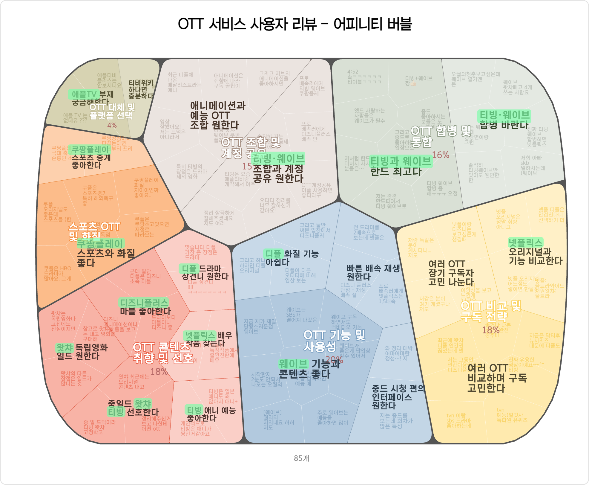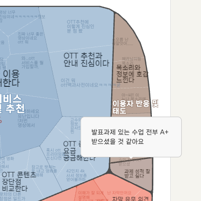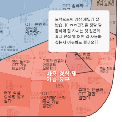 기본적으로 OTT 이용 행태가 구분되기는 하지만 ➊ "이용자 반응 및 태도"나 ➋ "사용자 경험 및 기능 요구" 클러스터에 묶여 있는 것을 살펴보면, OTT에 대한 사용자 의견이 아닌, 해당 영상과 채널에 대한 댓글들임을 알 수 있습니다. 또한 다양한 OTT 플랫폼이 두리뭉실하게 ➌ 하나의 클러스터(특정 OTT 플랫폼 및 기능)에 묶여 있는 모습들이 보입니다.