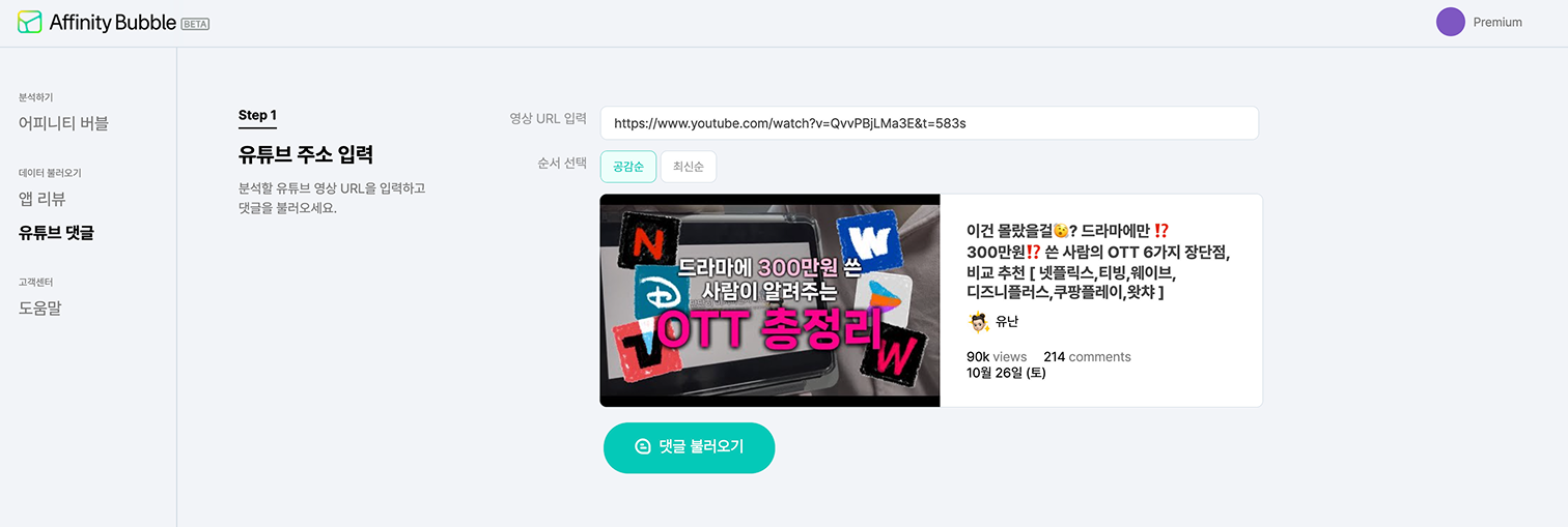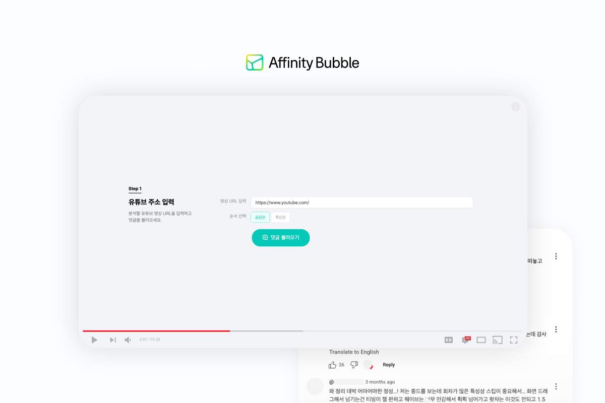 유튜브 영상 댓글을 분석하기 위해선 먼저 댓글을 불러와야겠죠? 크롤링할 수 있는 방법은 여러 가지가 있겠으나, 이번 포스트에서는 pxd가 개발 중인 '어피니티 버블'을 분석에 사용해 보려고 합니다.