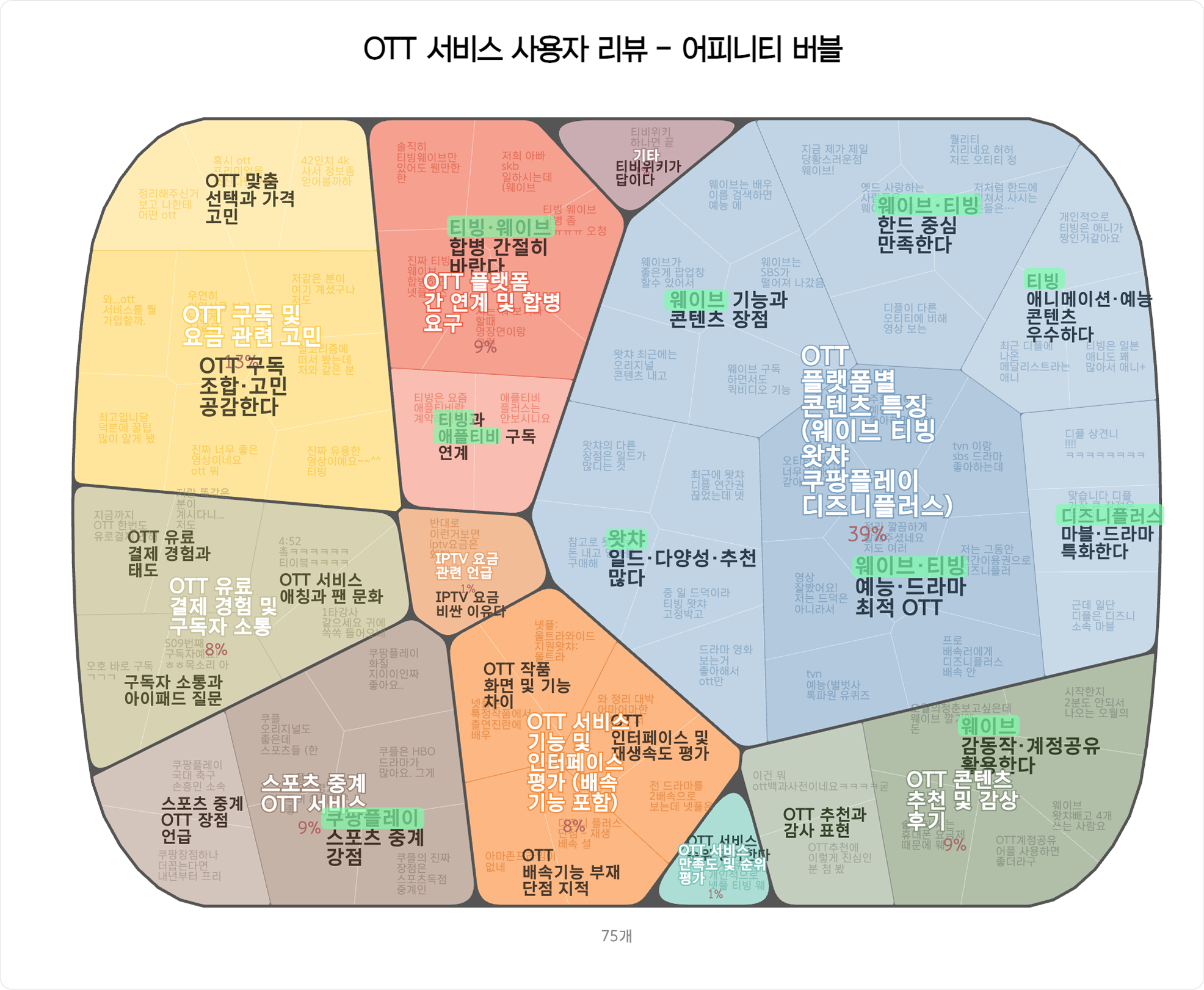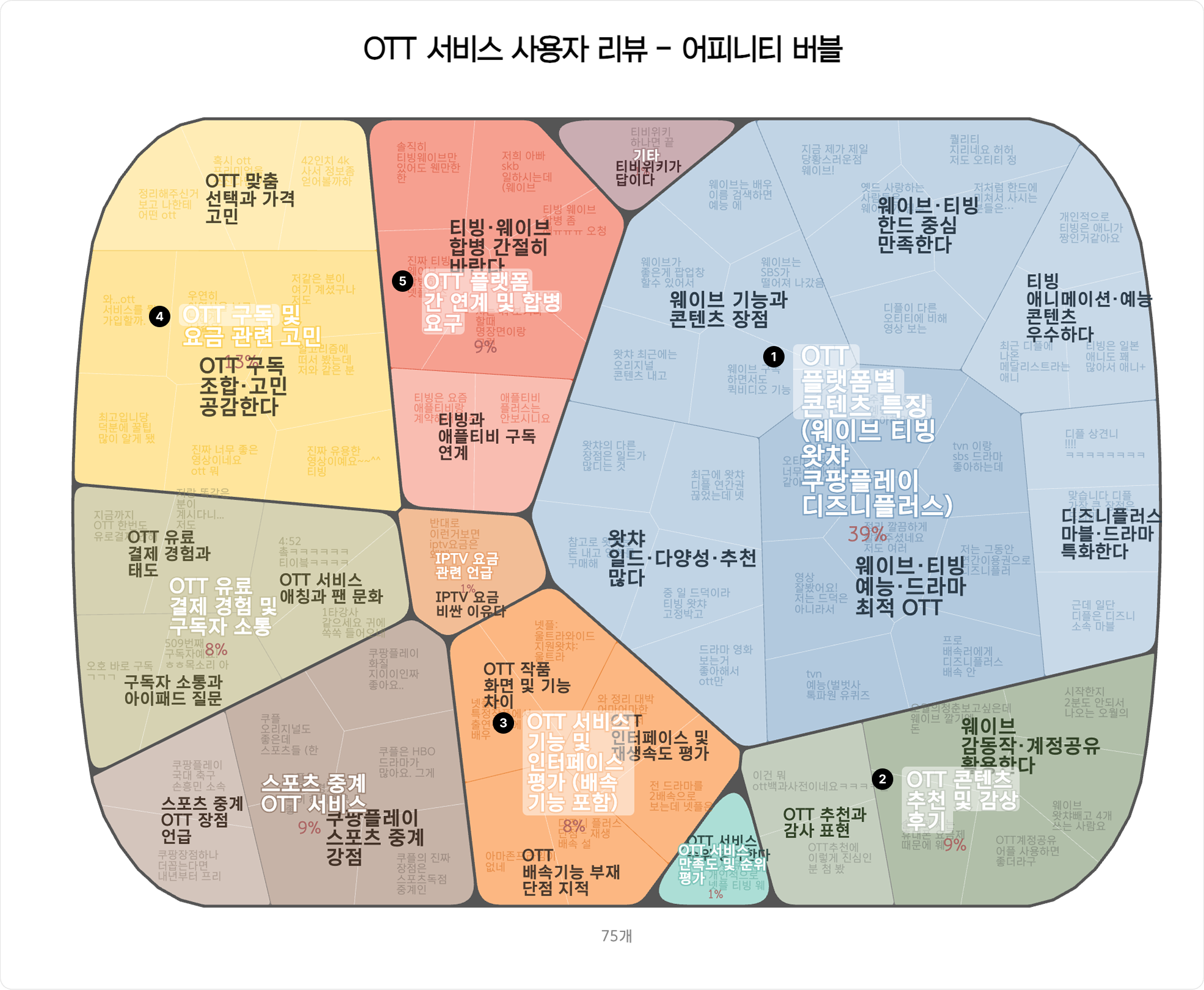 예를 들어, 이전 버블에서는 "콘텐츠 유형 및 활용 팁"과 "OTT 서비스 비교 및 추천" 클러스터의 내용이 사실상 뚜렷하게 구분되지 않았는데요. 현재는 ➊ OTT별 콘텐츠 특징, ➋ 콘텐츠 감상 후기, ➌ 기능, ➍ 구독 경험, ➎ OTT 조합 등으로 각 클러스터의 성격이 명확하게 구분되고 있습니다.