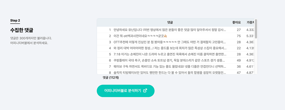 유튜브 영상의 URL을 입력하고 댓글 불러오기 버튼을 누르면, 댓글 목록이 나타납니다.