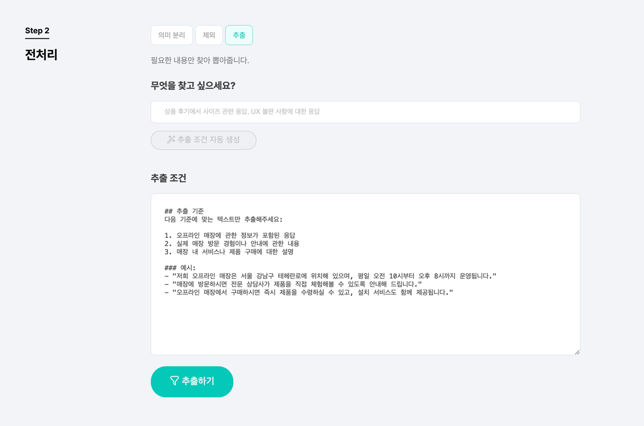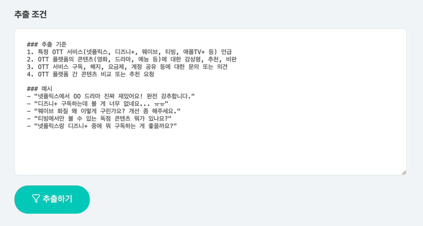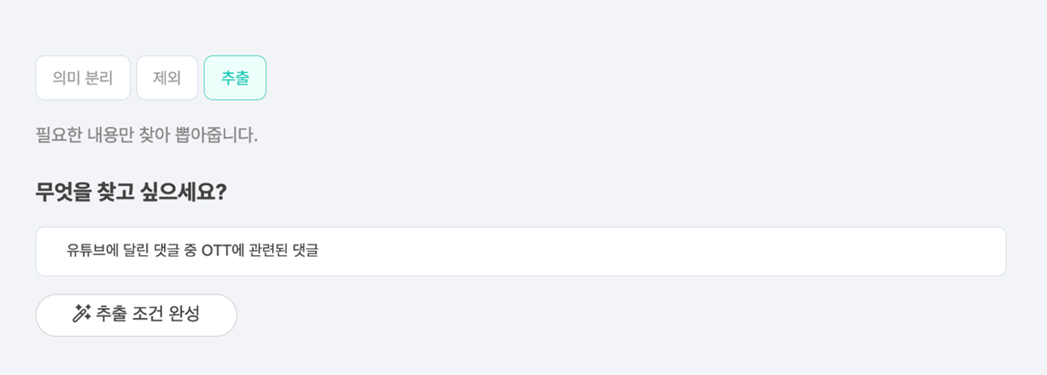 데이터 맥락을 더 잘 이해하게 하기 위해 "유튜브에 달린 댓글 중 OTT에 관련된 댓글"이라고 프롬프트를 입력했습니다. 그 후 추출 조건 완성 버튼을 누르면 조건이 자동으로 생성됩니다.
