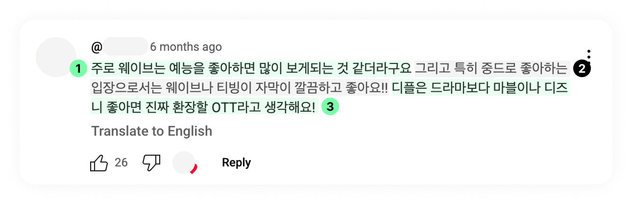 큼직큼직하게 사용자 의견을 볼 수 있다는 건 아주 좋습니다. 위 결과를 보고 나니, OTT별 사용자 의견을 나누어 살펴보고 싶어졌습니다. 그런데 하나의 댓글 안에 서로 다른 이야기가 섞여 있는 경우가 많은데요.