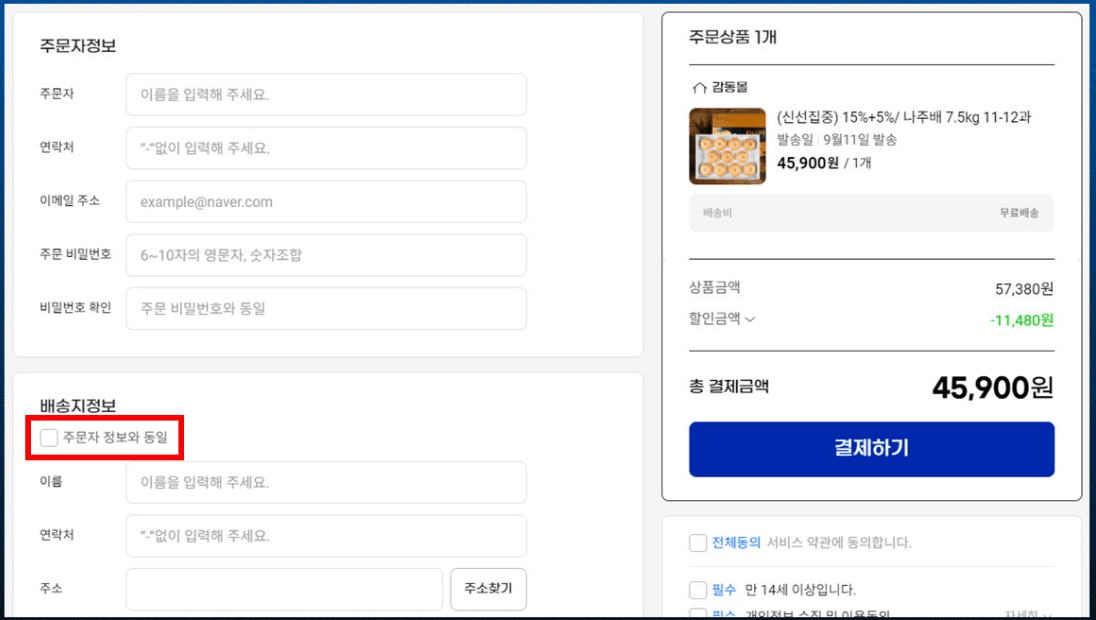 - 준수 사례 2 : 배송지 정보를 주문자정보와 동일하게 입력 가능하도록 제공