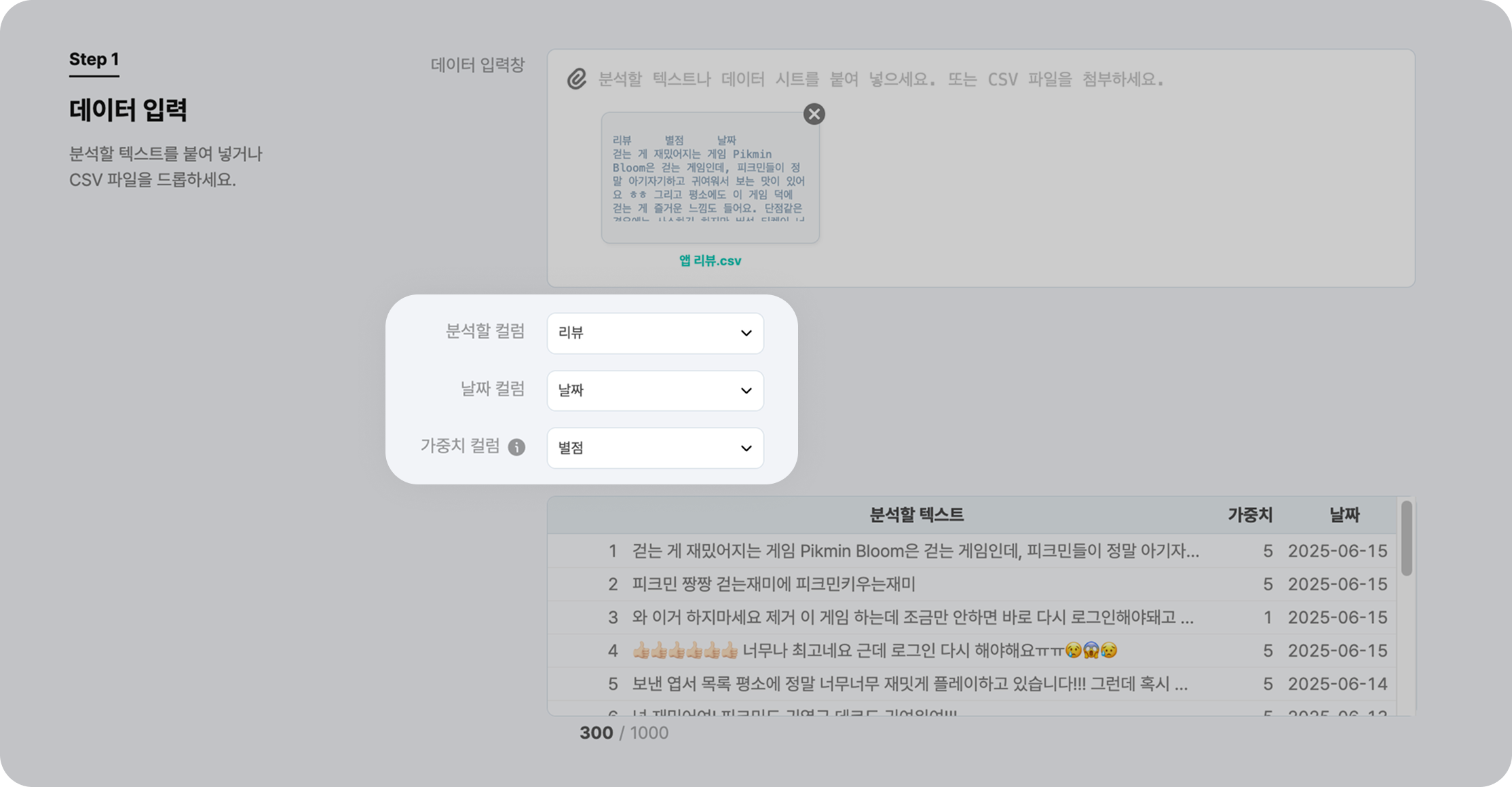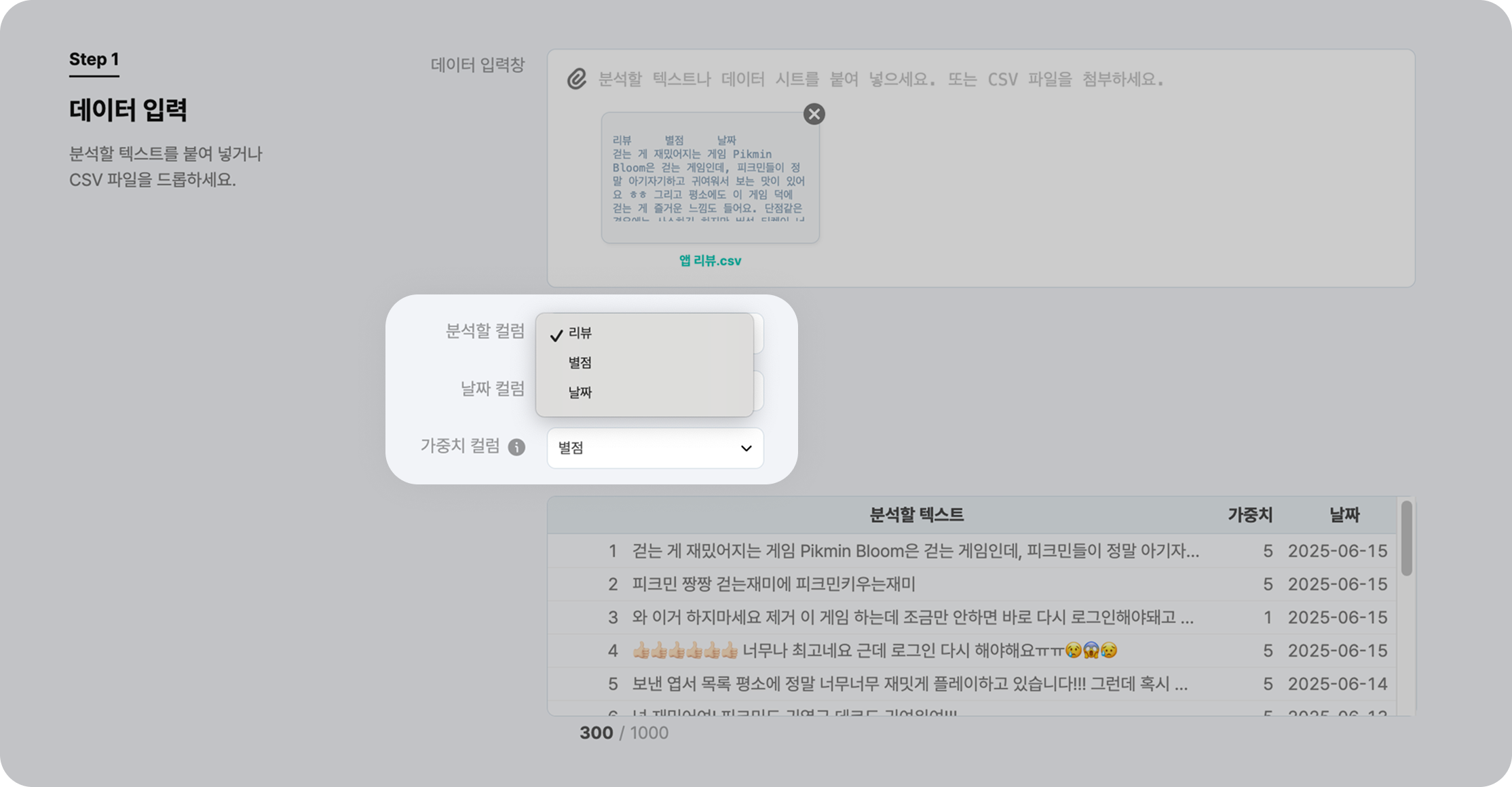 용어들도 이해하기 쉽게 바꿨는데요. 데이터매핑 대신 CSV 파일에서 범용적으로 사용되고 있는 '컬럼'이라는 단어로써 분석하고자 하는 데이터 항목을 설정할 수 있게 했습니다. 컬럼이 여러 개일 경우, 데이터 시트의 최상단 레이블을 바탕으로 컬럼을 인식하고 리스트를 생성해 주며, 분석할 정보가 있는 컬럼이 자동으로 선택됩니다. 다른 컬럼을 분석하고 싶다면 수동으로 선택하시면 됩니다.