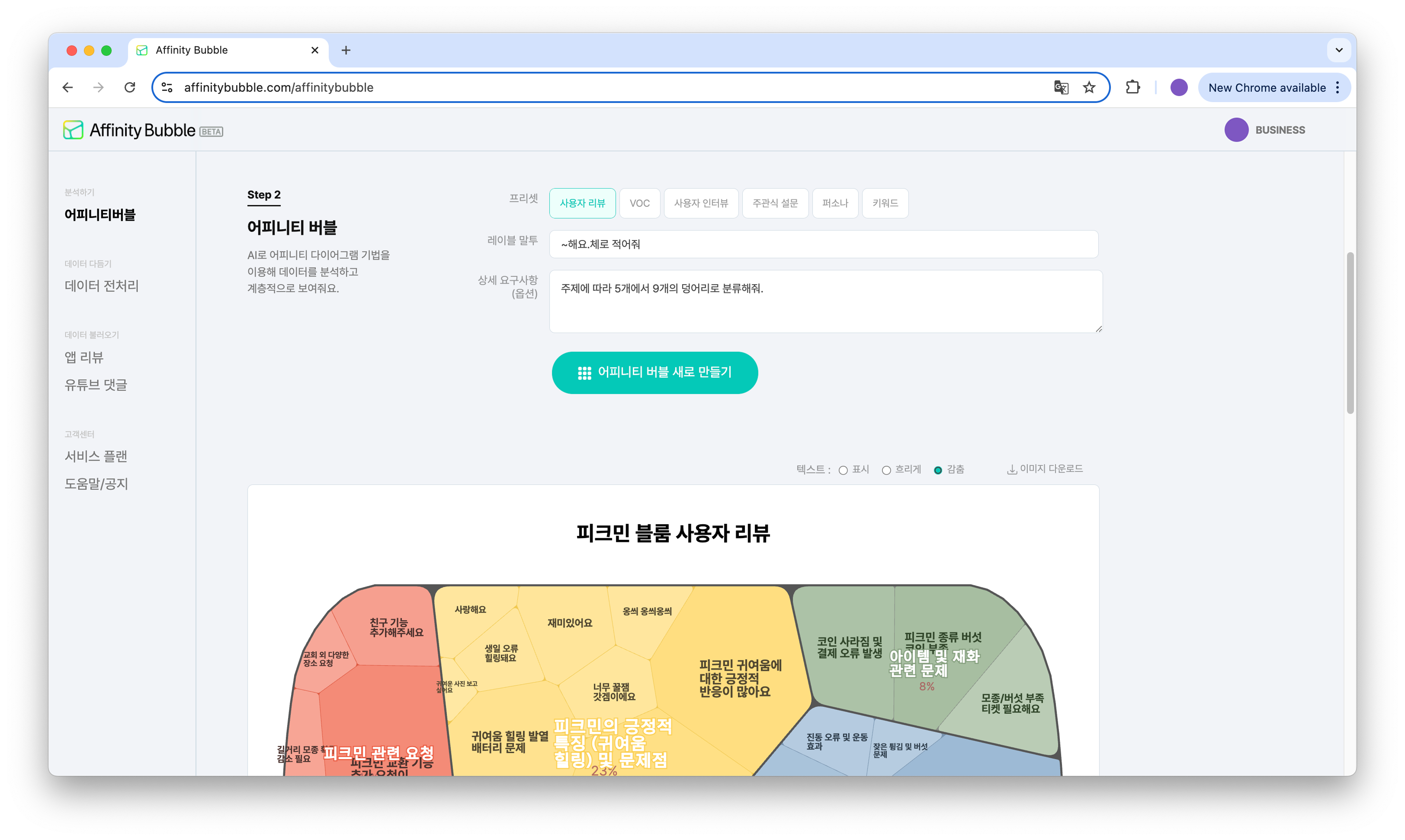 사용자가 '고객의 목소리로부터 빠르게 의미 있는 니즈를 읽고 좋은 인사이트를 얻길 바라는 마음'으로 만들기 시작한 '어피니티버블'은 올해 초 베타 버전을 공개한 이후 지금까지 기능과 성능을 강화해 왔는데요. 9월 1일부터는 방대한 데이터 분석도 가능한 유료 플랜을 제공하게 되었습니다.