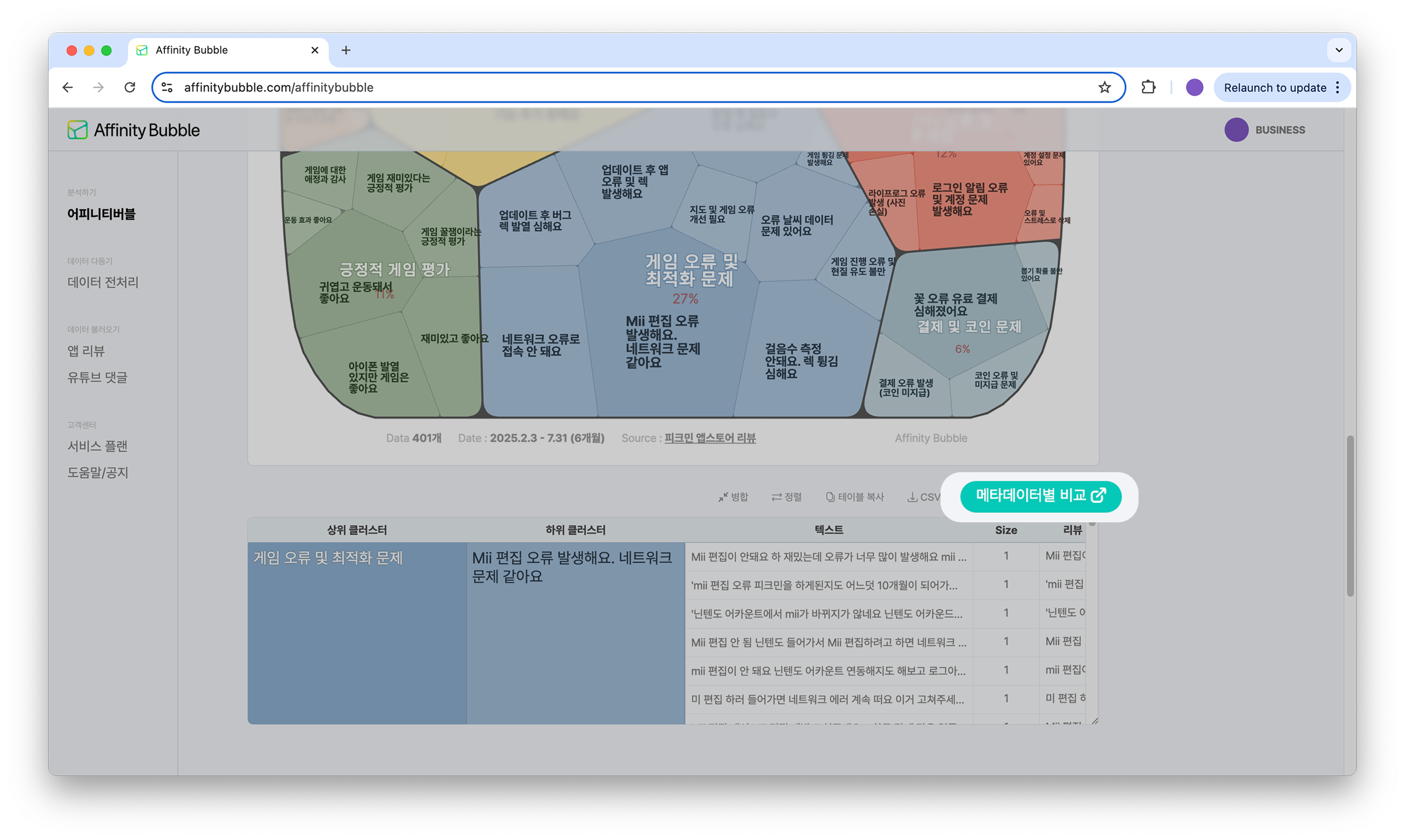 리서처들에게는 응답 날짜, 고객의 나이, 성별과 같은 특징들이 담긴 메타데이터가 유의미한데요. 기존 어피니티버블은 하나의 항목에 대해서만 분석할 수 있었습니다. 응답을 한눈에 보기엔 유용했으나 실무에서는 조금 아쉬웠죠. 그래서 분석한 어피니티버블을 메타데이터별로 비교하는 기능을 추가했습니다.