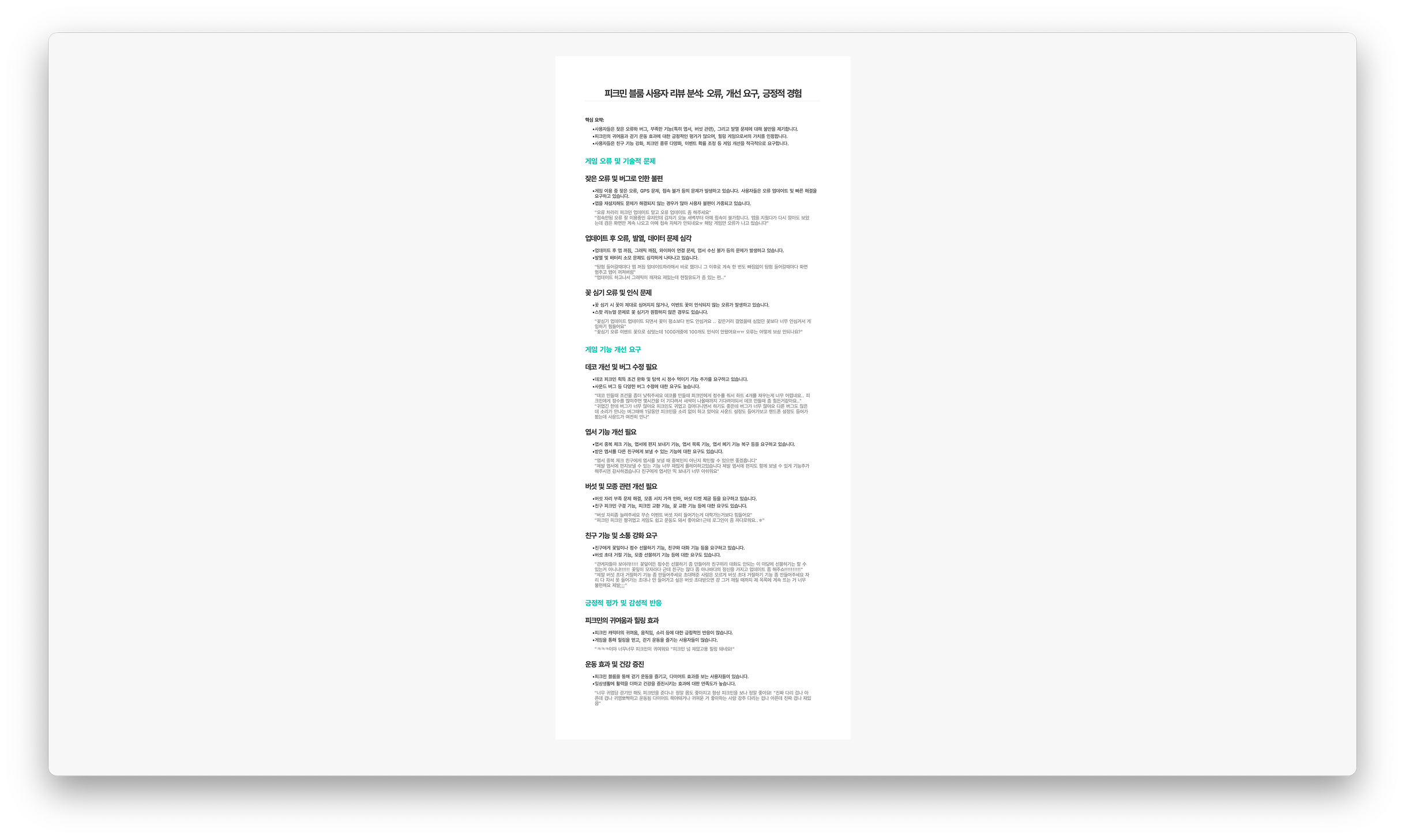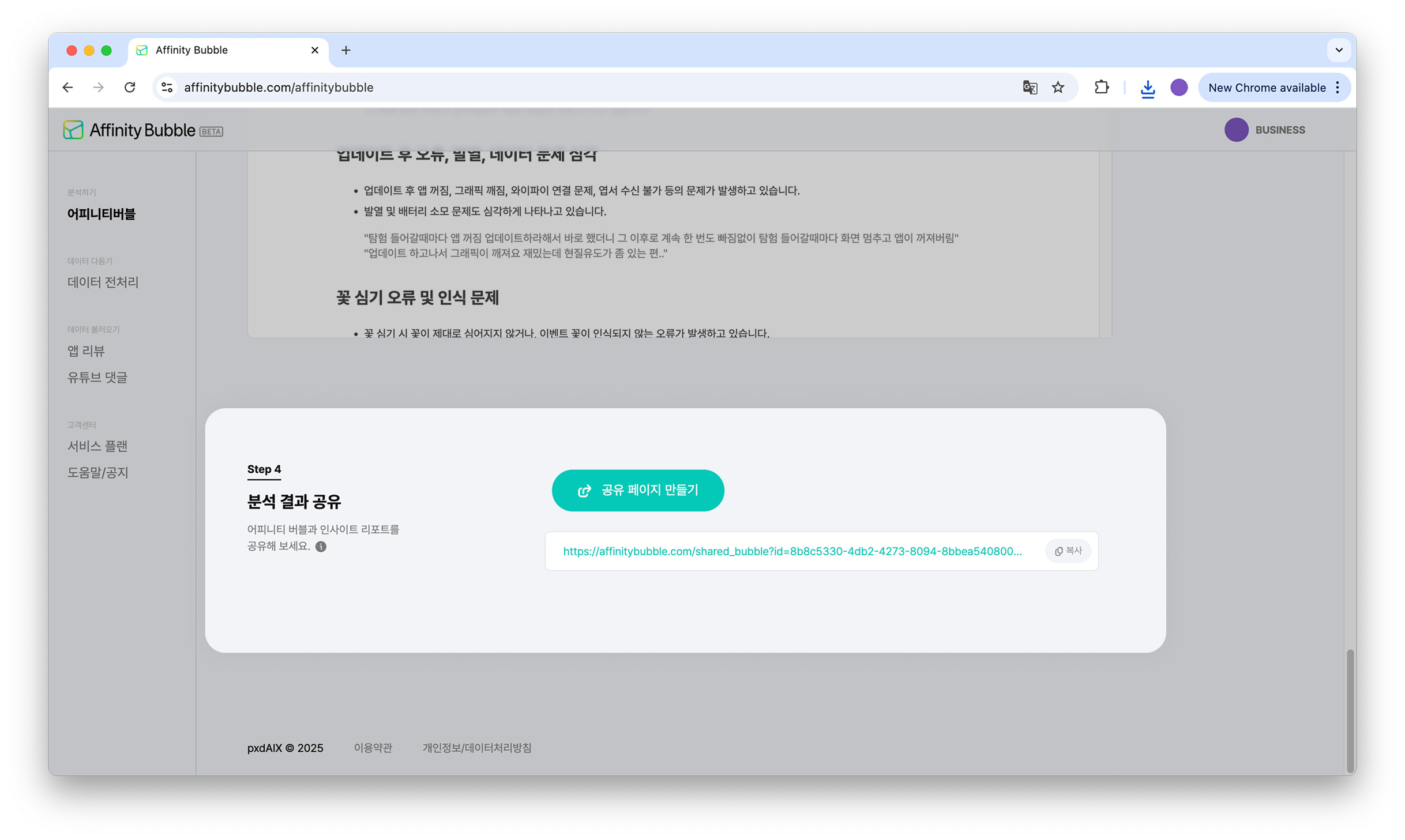 분석 결과를 요약하여 인사이트를 도출해 주는 인사이트 리포트 기능도 사용할 수 있습니다. 실제로 실무에서 유용하게 사용되고 있고, UXR 밋업 때도 좋은 반응을 얻은 기능이죠. 인사이트 리포트는 어피니티버블 공유 페이지 하단에 포함됩니다.