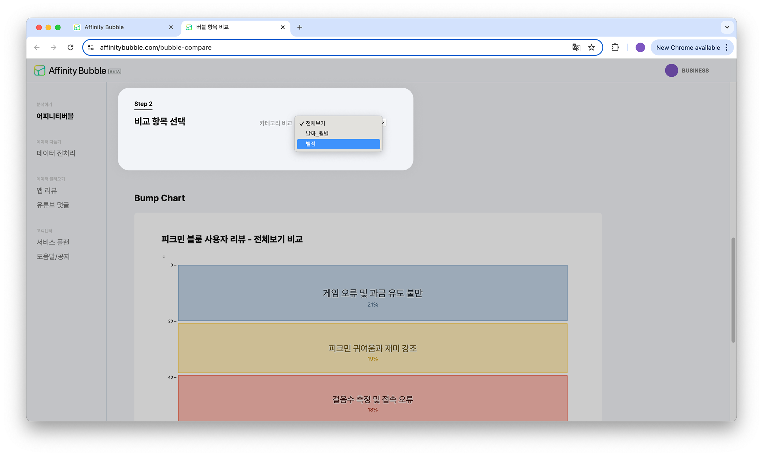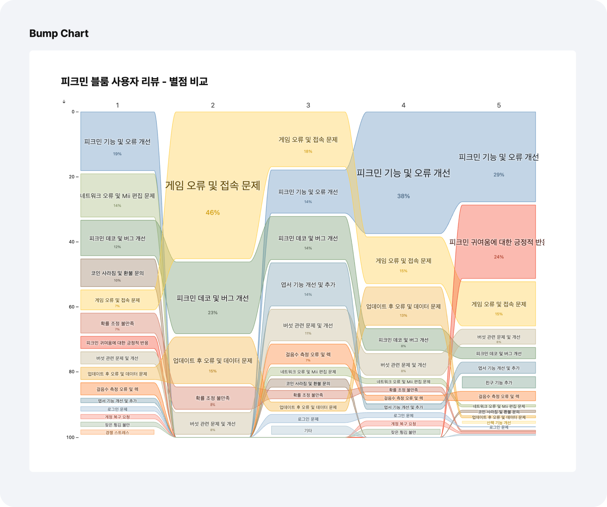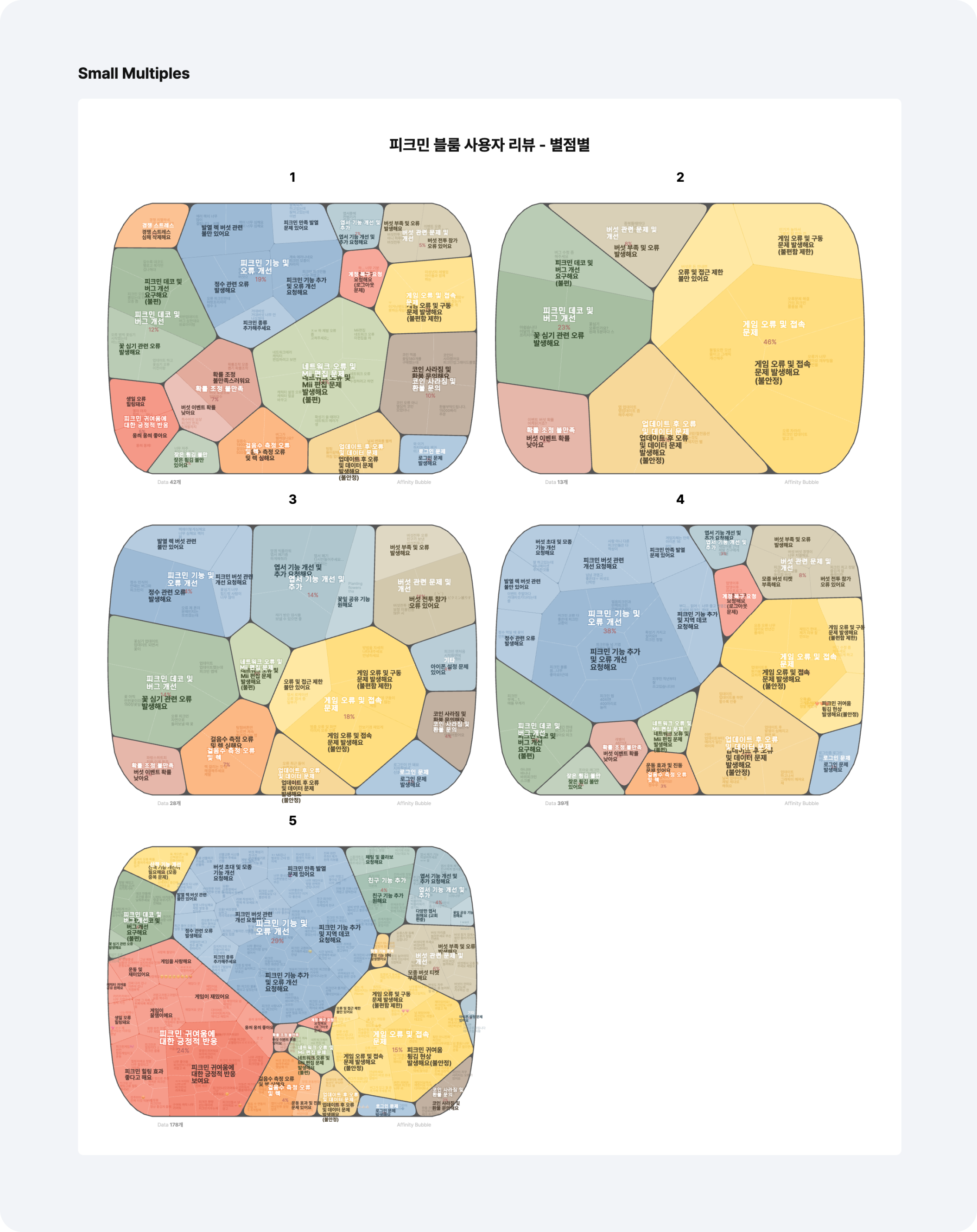 도출된 클러스터가 이루는 전체적인 비율부터, 별점과 같은 사용자 그룹에 따른 어피니티버블 비교, 월별 비교와 같은 시계열 조회가 가능합니다. 데이터 입력 시 메타데이터에 대한 칼럼만 추가되어 있다면, 무엇이든 비교해서 볼 수 있죠. 현재는 어피니티버블 여러 개를 한 번에 비교할 수 있는 스몰멀티플 차트와, 카테고리에 따른 응답 비율을 시각화한 범프 차트를 지원하고 있습니다.