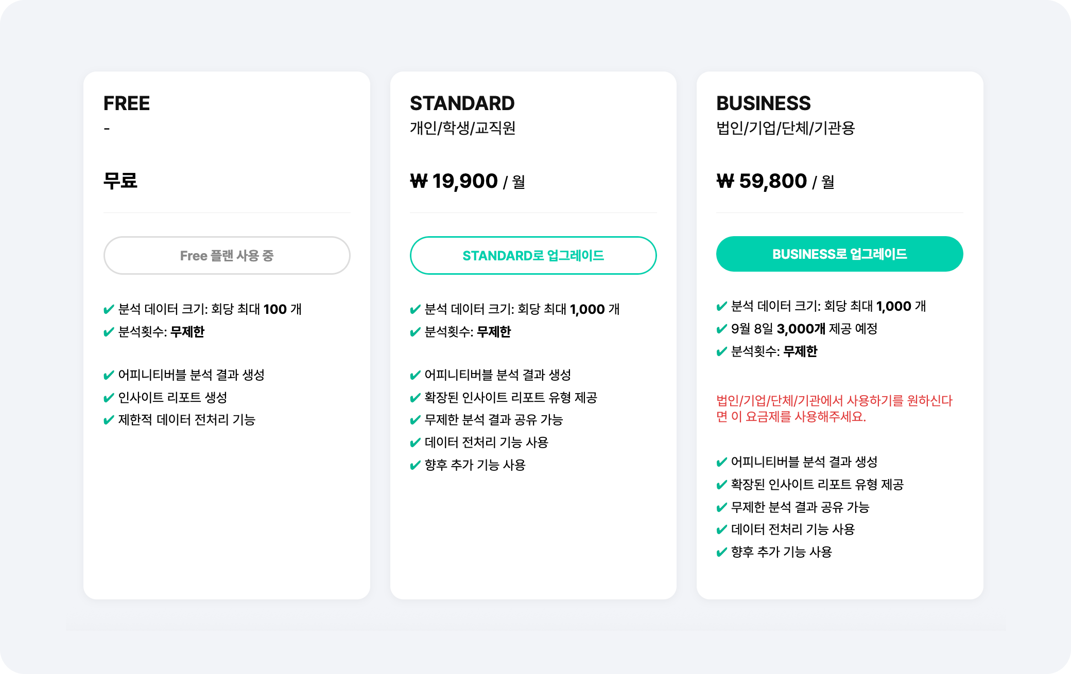 가볍게 시작해보고 싶다면 Free 플랜을 이용해 보세요. 개인이나 학생 사용자에게 꼭 맞는 핵심 기능들로 구성되어 있습니다. Free 플랜으로도 앞서 소개한 기능들을 사용하실 수 있는데요. 이때, 분석 시 지원하는 데이터 크기는 회당 100건이며, 공유 URL을 생성해 분석 결과를 다른 사람에게 공유할 수 있습니다.