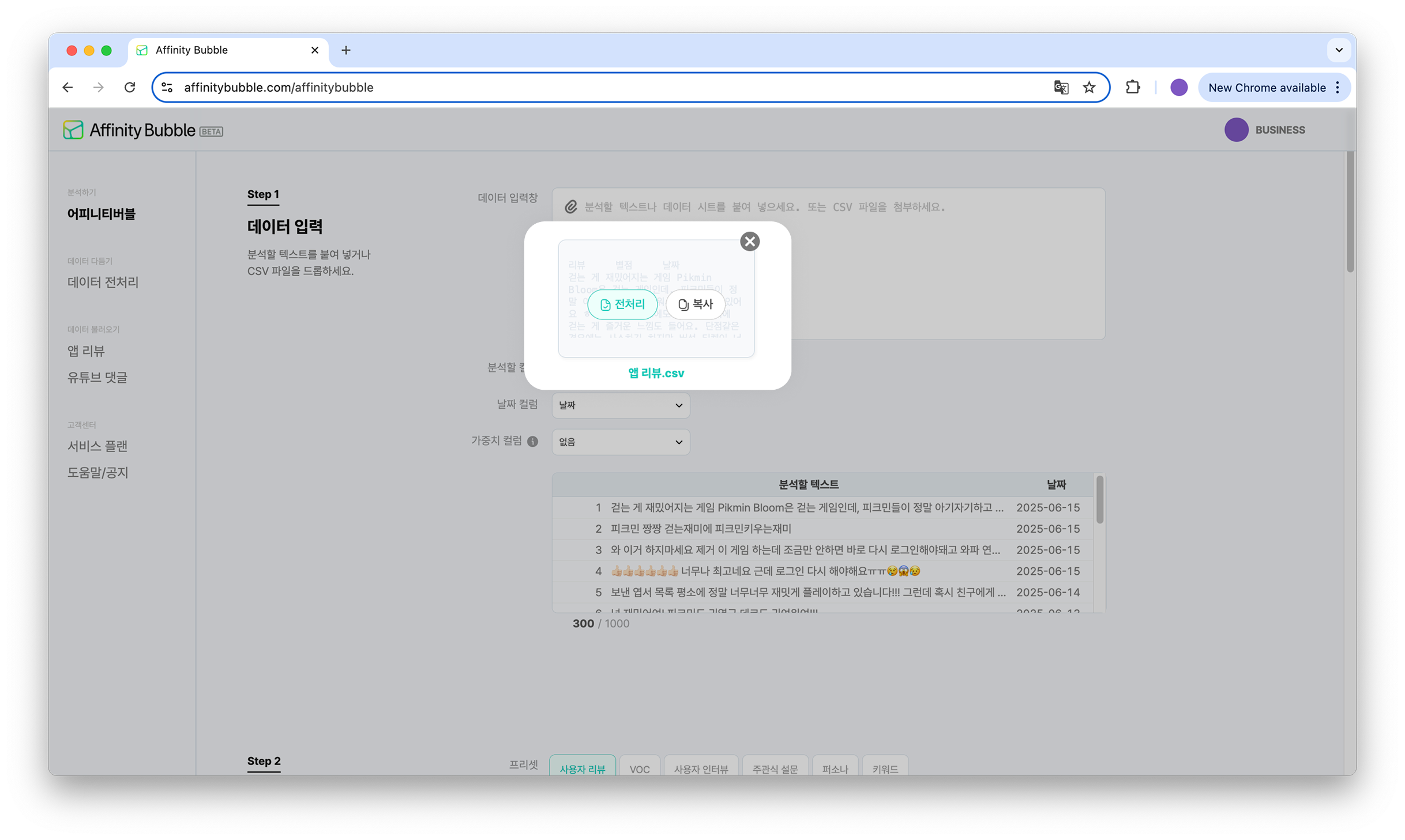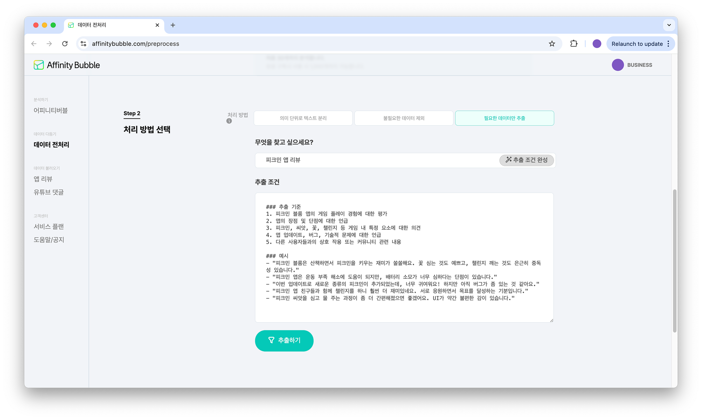 또한, Free 플랜에서도 데이터 전처리 기능을 제한적으로 사용할 수 있습니다. 정확한 데이터 분석을 위해서는 데이터의 의미를 분리하고, 원하는 데이터를 추출하고, 불필요한 데이터를 제거하는 과정이 필요한데요. 어피니티버블은 이처럼 데이터의 노이즈를 제거하고 정제하는 데이터 전처리 기능을 제공합니다.