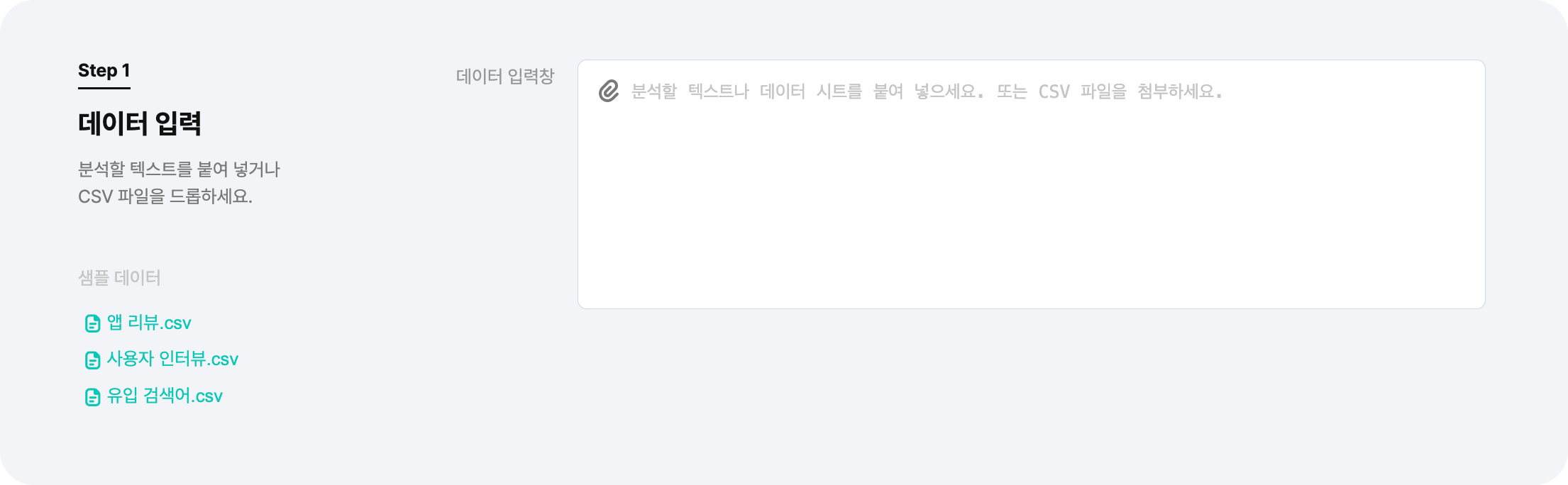 UX디자인 전문 회사로서 자체 업무의 효율을 높이고자 만들기 시작한 이 데이터 분석 AI툴을 베타 버전으로 공유했고, 좋은 평을 받으며 더욱 힘을 내 개발했어요. 여러분들의 분석 업무에 효율과 활력을 드리고 싶은 마음이 전달되길 바랍니다.