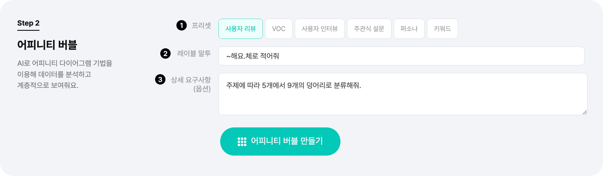 어피니티버블로 분석할 때, 선택할 수 있는 옵션이 많았지만 그중 어느 것이 리서처가 가진 데이터에 더 적합한지, 각 옵션마다 어떤 차이가 있는지 이해하기 어렵다는 의견이 있었는데요. 프리셋을 활용하면 설정이 더 쉬워집니다. 어피니티버블이 제공하는 프리셋을 선택하고 상세 요구사항 입력창을 통해 원하는 바를 자유롭게 주문할 수 있어요.