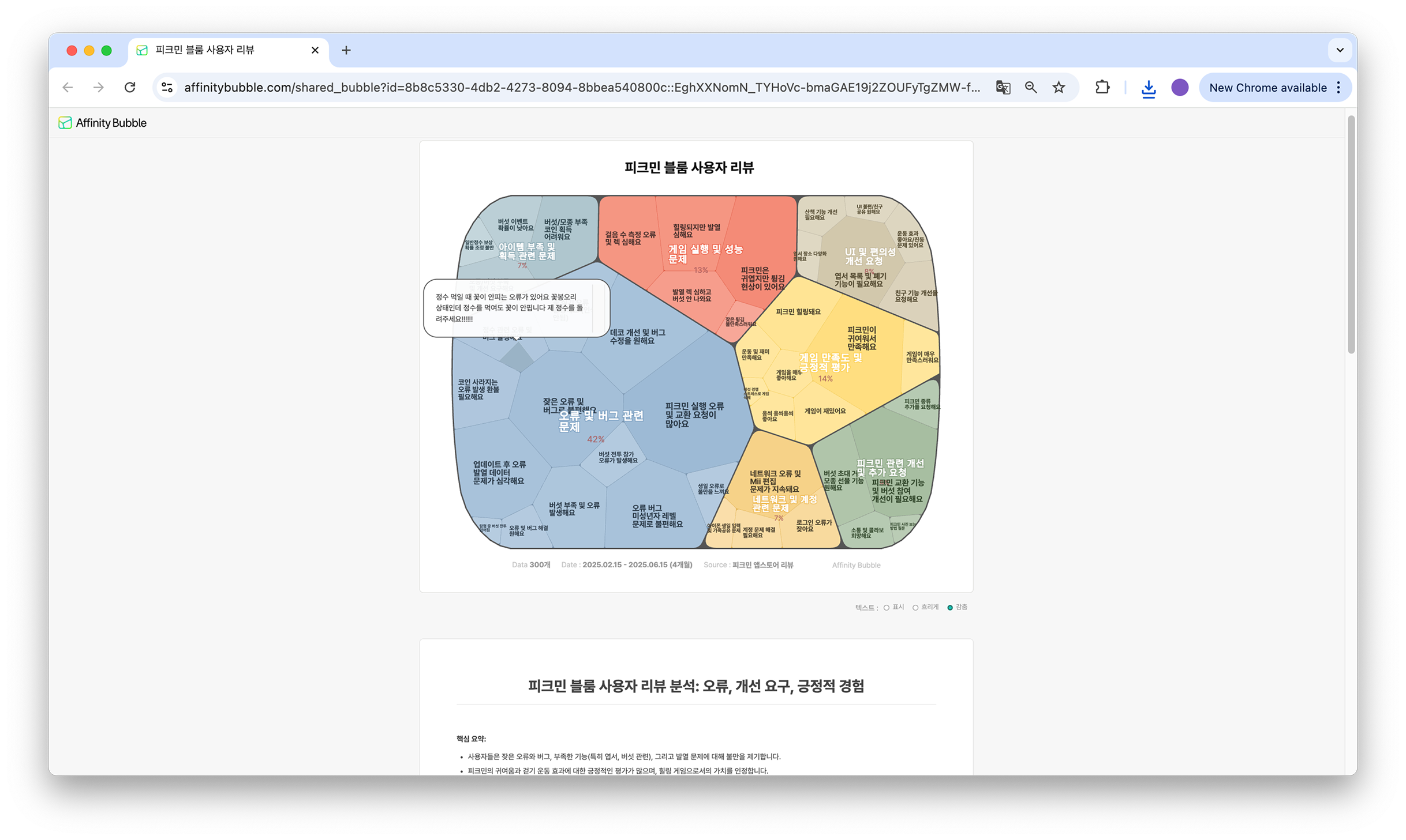 분석 결과를 요약하여 인사이트를 도출해 주는 인사이트 리포트 기능도 사용할 수 있습니다. 실제로 실무에서 유용하게 사용되고 있고, UXR 밋업 때도 좋은 반응을 얻은 기능이죠. 인사이트 리포트는 어피니티버블 공유 페이지 하단에 포함됩니다.