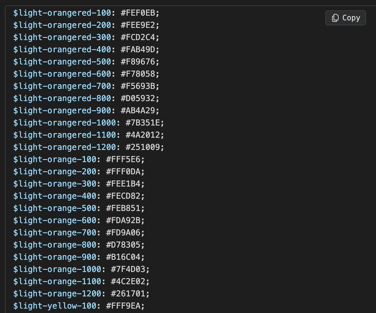 그리고 XE 그룹은 자체 제작 플러그인을 통해서 발행된 파운데이션 문서의 토큰 값을 프로젝트 컨벤션에 맞는 SCSS 변수로 변환 추출합니다. 해당 추출 값들은 보통 아래와 같은 형식으로 변환되죠.