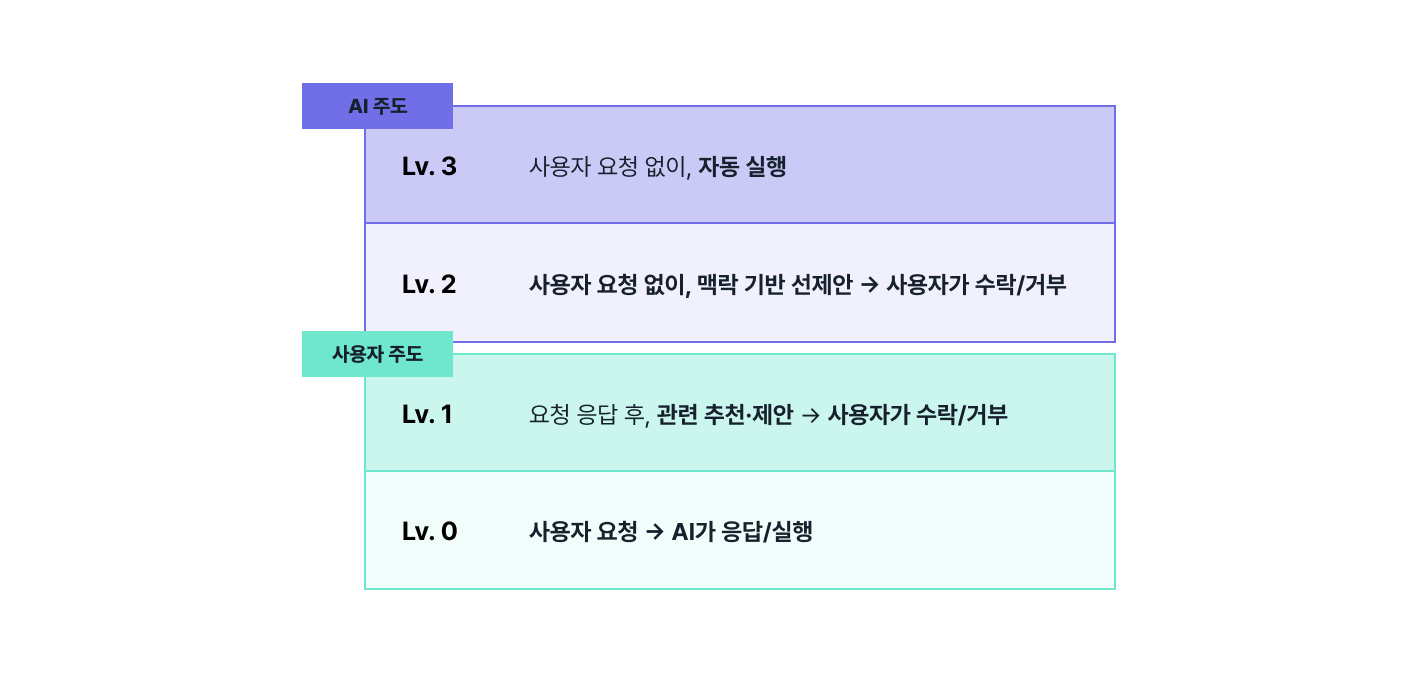 이번 프로젝트 리서치에서 저희가 정의한 기준에 따르면, Proactive AI는 능동성의 정도에 따라 네 가지 수준으로 구분할 수 있습니다.