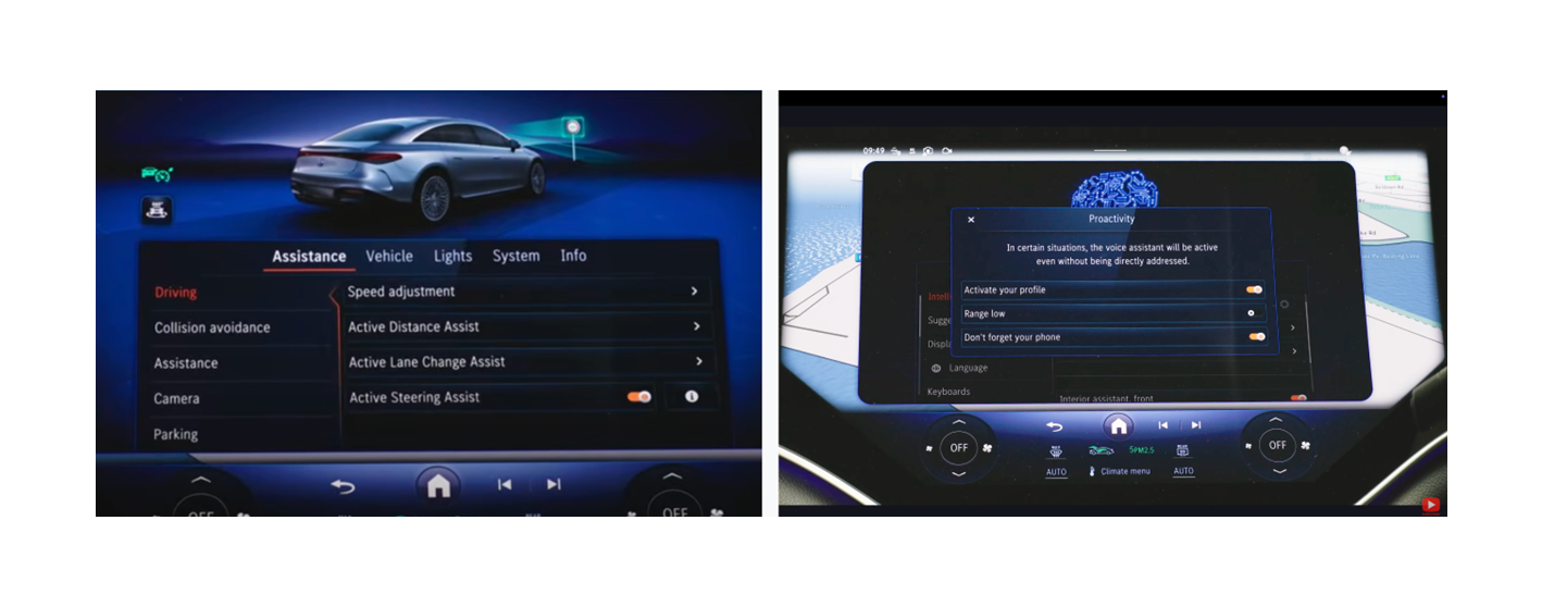 벤츠는 BMW보다 다양한 기능에 대해 proactivity를 설정할 수 있었습니다. 그러나 음성 명령으로 제어 가능한 약 100여 개 기능 중 실제로 Proactivity를 설정할 수 있는 항목은 30개 수준에 불과했습니다. 어떤 기능이 가능한지 확인하려면 일일이 눌러봐야 했고, 조정도 개별 기능의 상세 화면에 들어가야만 가능했습니다. 설정 범위가 넓다는 장점은 있었지만, 접근성과 UX가 복잡해 번거롭다는 한계가 명확했습니다.
