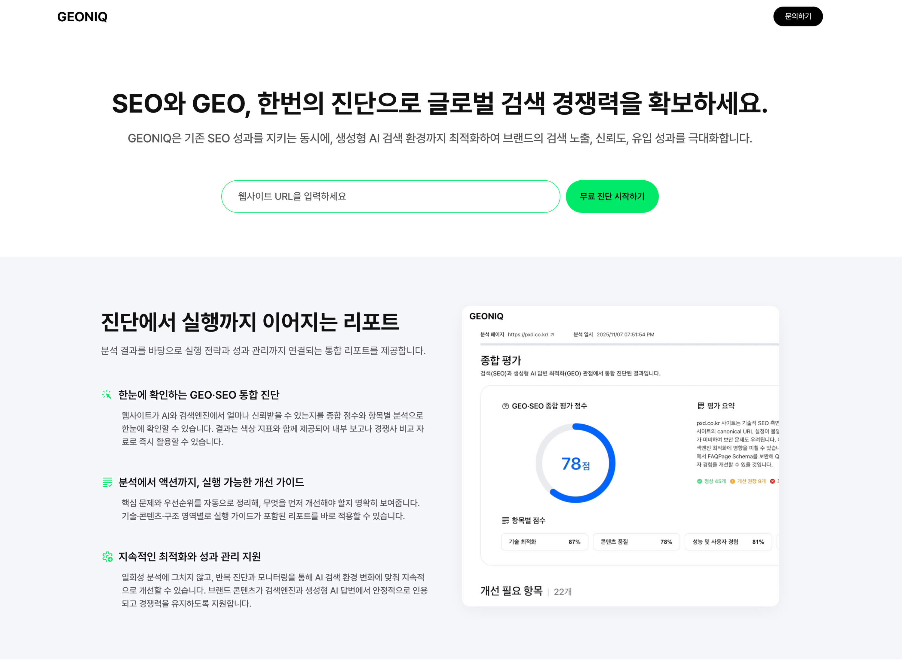 GEONIQ은 SEO와 GEO를 통합적으로 분석하고, 실행 가능한 개선 가이드를 제공하는 AI 진단 도구입니다. 기존 SEO 분석이 '검색엔진 노출'에 집중했다면, GEONIQ은 생성형 AI가 콘텐츠를 어떻게 이해하고 평가하는지를 정밀하게 분석합니다.