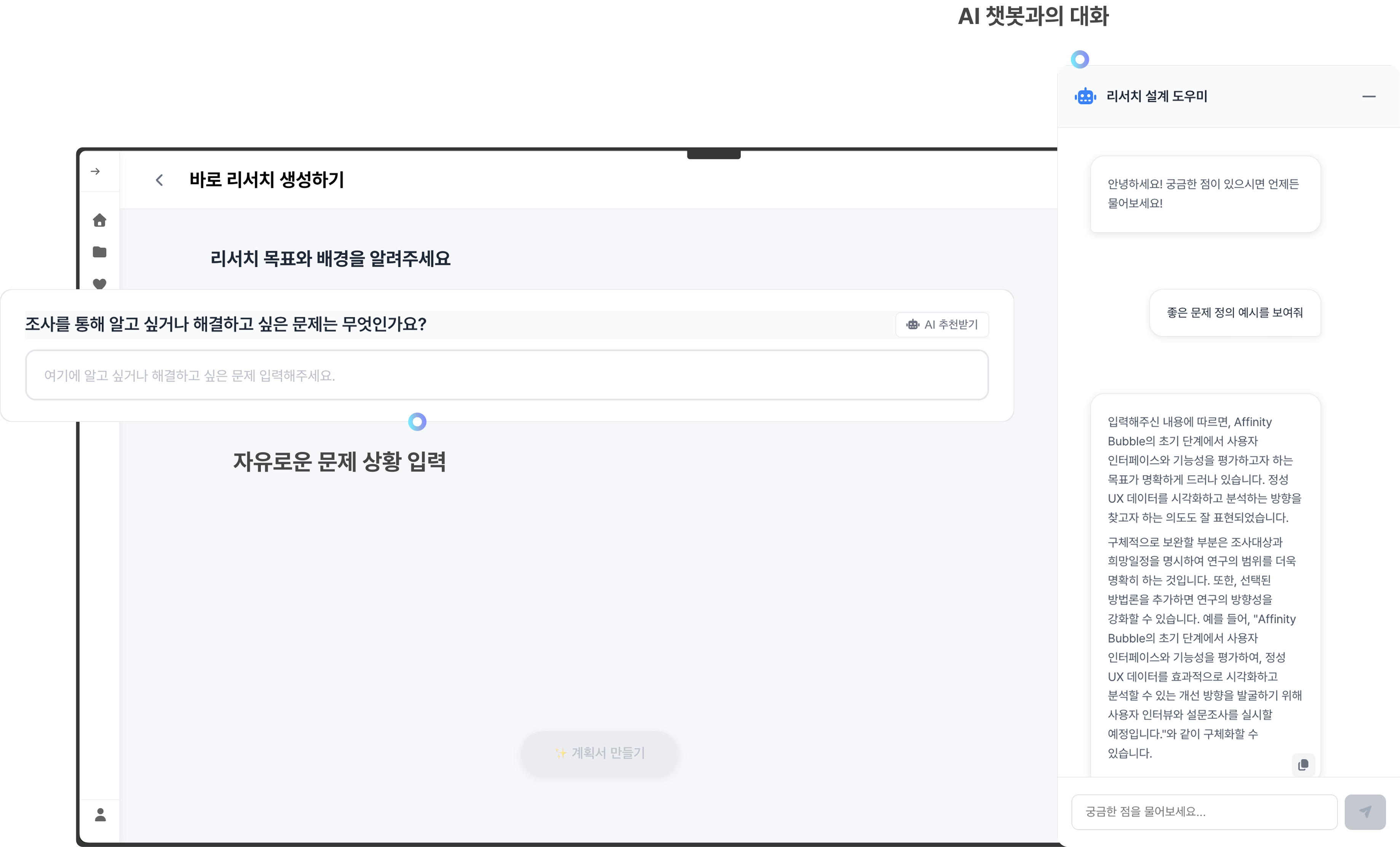 하지만 ReOpsAI와 함께라면 걱정할 필요 없습니다. '서비스의 문제 상황' 또는 '사용자에 대한 단 하나의 궁금증'만으로도 체계적인 리서치 계획서를 완성할 수 있습니다. ReOpsAI의 계획서는 pxd의 오랜 노하우가 집약된 데이터베이스를 기반으로 작동합니다. 이를 통해 유사한 사례를 탐색하고 전문적인 방법론을 적용하여 계획서를 즉시 생성하죠.