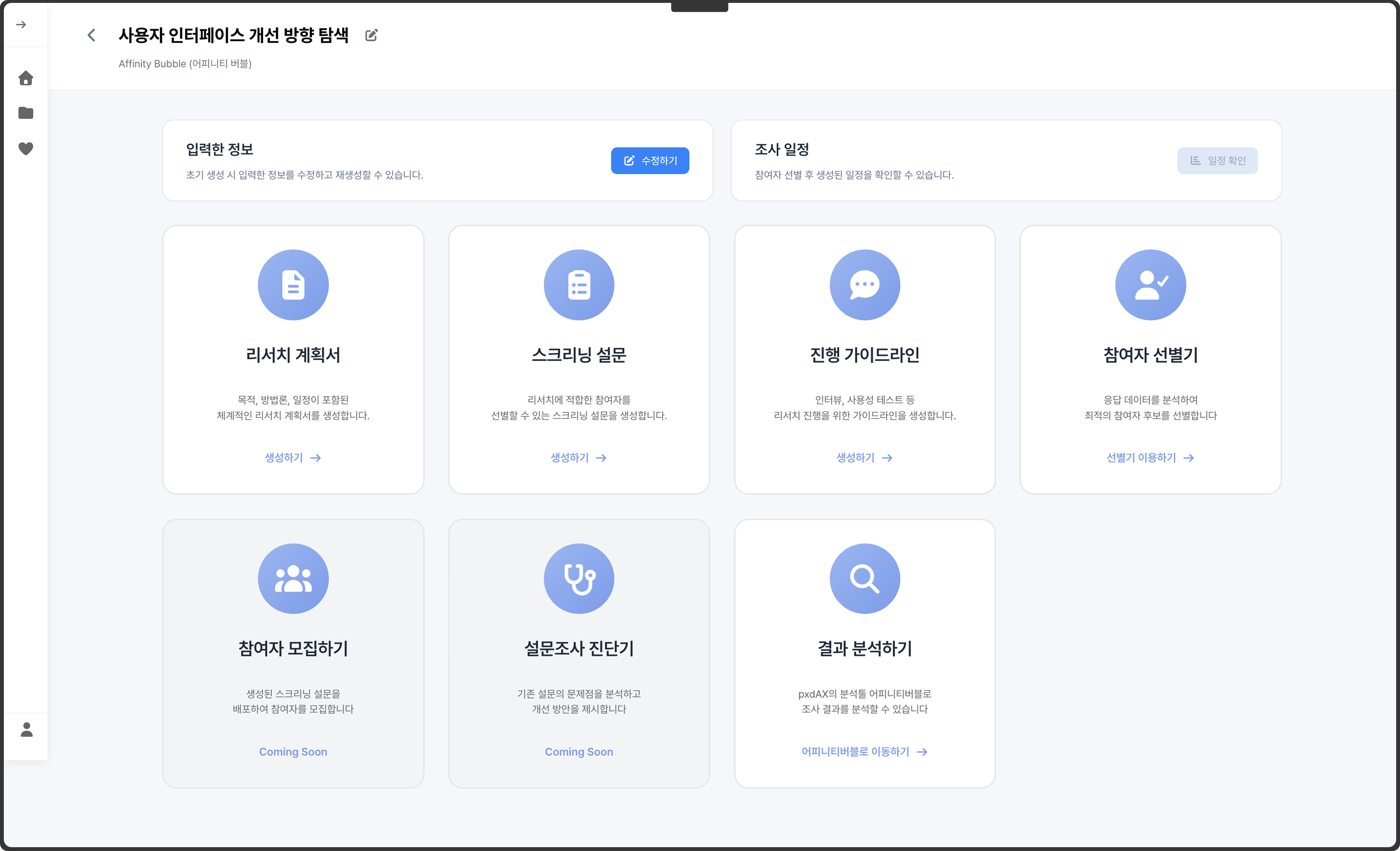 1️⃣ 베타 전용 무제한 이용 권한 제공: 베타 운영 기간 동안 일반 유저에게는 제공되지 않는 특별한 무제한 사용 권한을 드립니다. 리서치 계획서, 스크리닝 설문, 진행 가이드라인을 자동으로 생성하며 리서치 설계 전 과정을 제한 없이 체험해 보세요.