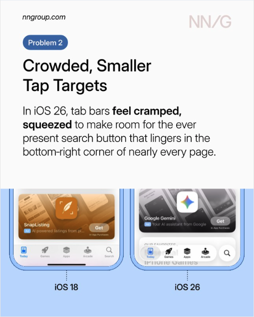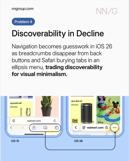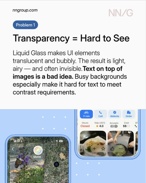 NN/g는 최근 "Liquid Glass는 깨졌다(Liquid Glass Is Cracked)"라는 칼럼을 통해, Apple의 새로운 디자인 언어가 '스펙터클'을 위해 '사용성'을 희생하고 있다고 지적했습니다.