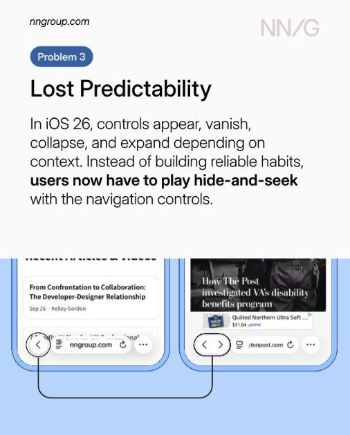 NN/g는 최근 "Liquid Glass는 깨졌다(Liquid Glass Is Cracked)"라는 칼럼을 통해, Apple의 새로운 디자인 언어가 '스펙터클'을 위해 '사용성'을 희생하고 있다고 지적했습니다.