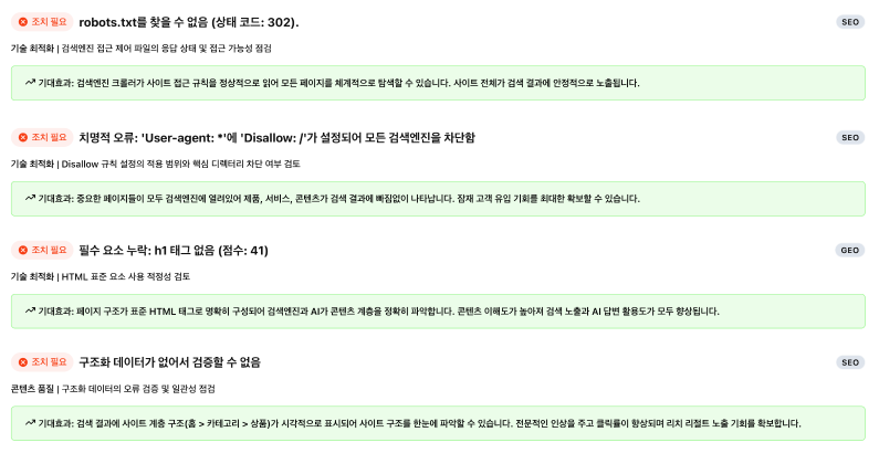 이 항목들은 GEONIQ 진단 기준상 AI 후보 수집과 답변 인용 가능성을 상대적으로 빠르게 개선할 수 있는 요소들이다.