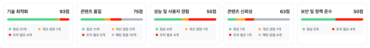 - 성능(LCP) 및 canonical 설정 미흡으로 신뢰 신호가 약하다.