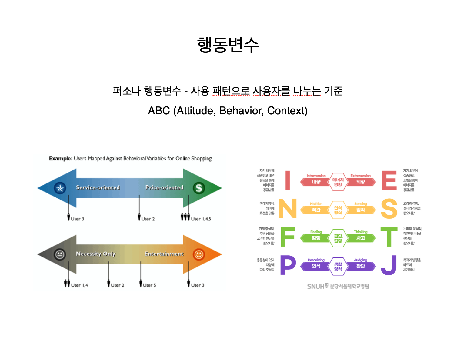 MBTI와 사용자 조사의 작동 원리가 똑같다면, 믿어지시나요? MBTI에서 외향/내향, 감각/직관처럼 사람을 나누는 기준을 만들고, 그 기준에 따라 유형을 분류하는 작업은 사실 사용자 유형을 세분화하는 작업과 같은데요. 이 기준을 UX에서는 "행동 변수"라고 부릅니다.