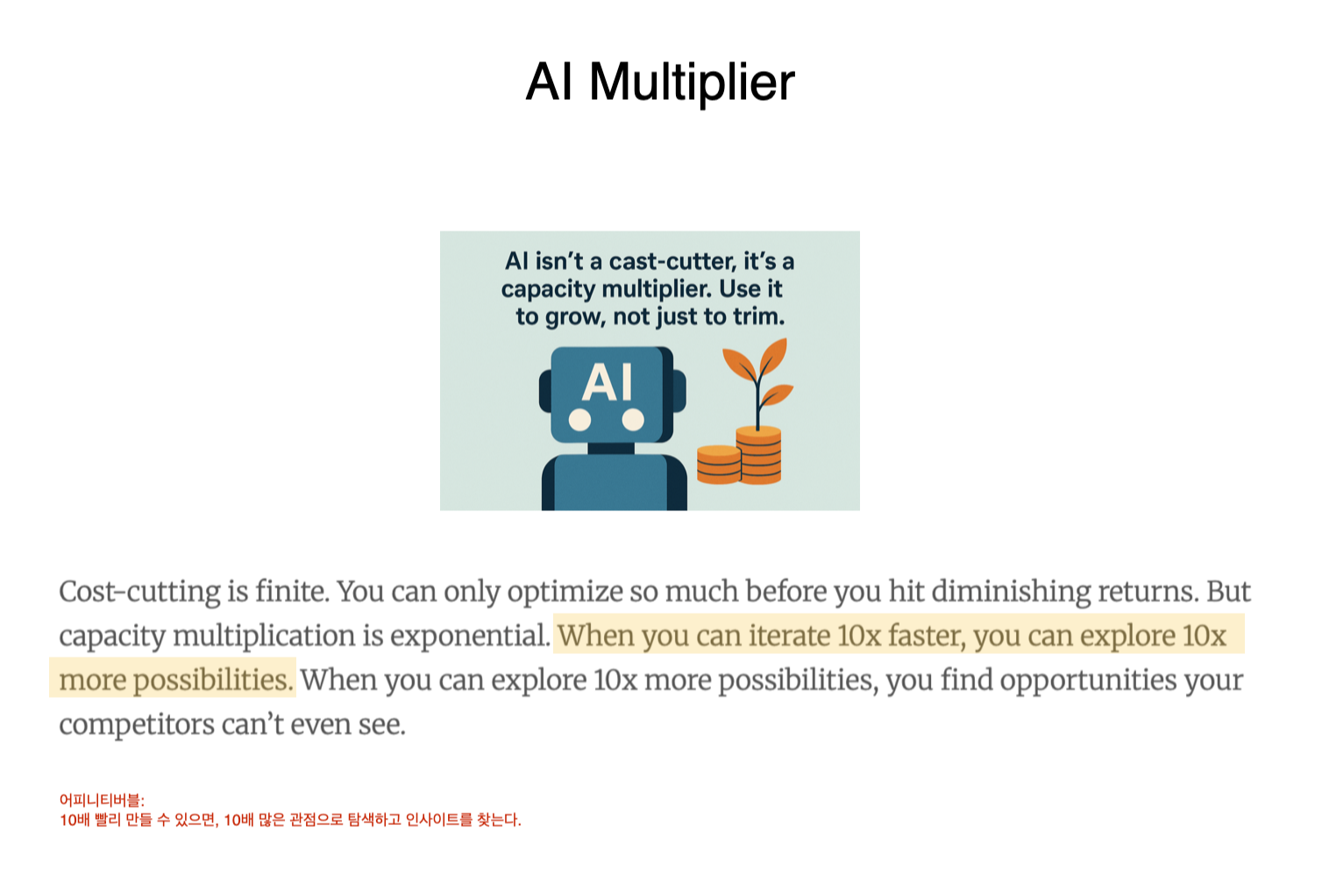 10배 빠르게 작업할 수 있다면, 같은 시간 안에 10배 많은 관점으로 탐색할 수 있습니다. 어피니티버블이 AI Multiplier로 불리는 이유입니다. 앱 리뷰를 분석하더라도 사용자 행동 목표 기준으로 볼 수도 있고, 긍부정 기준으로 볼 수도 있고, 시간대별로 볼 수도 있습니다. 관점을 바꿀 때마다 새로운 인사이트가 나옵니다.