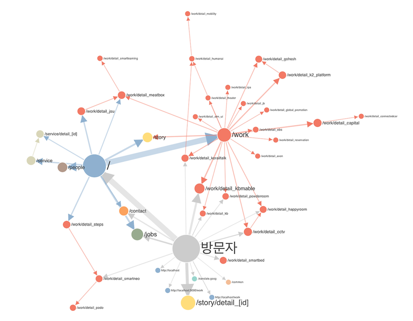 사용자의 이동 경로를 키워드별로 분석하면, 특정 검색어로 방문한 사용자의 니즈에 따라 사용 패턴의 차이를 파악할 수 있습니다. 어떤 페이지나 상품에 관심을 보이는지 알 수 있는 것이죠. 원의 크기는 방문자 수를, 화살표의 크기는 이동 빈도를 나타냅니다. 원이 클수록 많은 사용자가 방문한 페이지이며, 화살표가 굵을수록 이동이 많은 경로입니다.