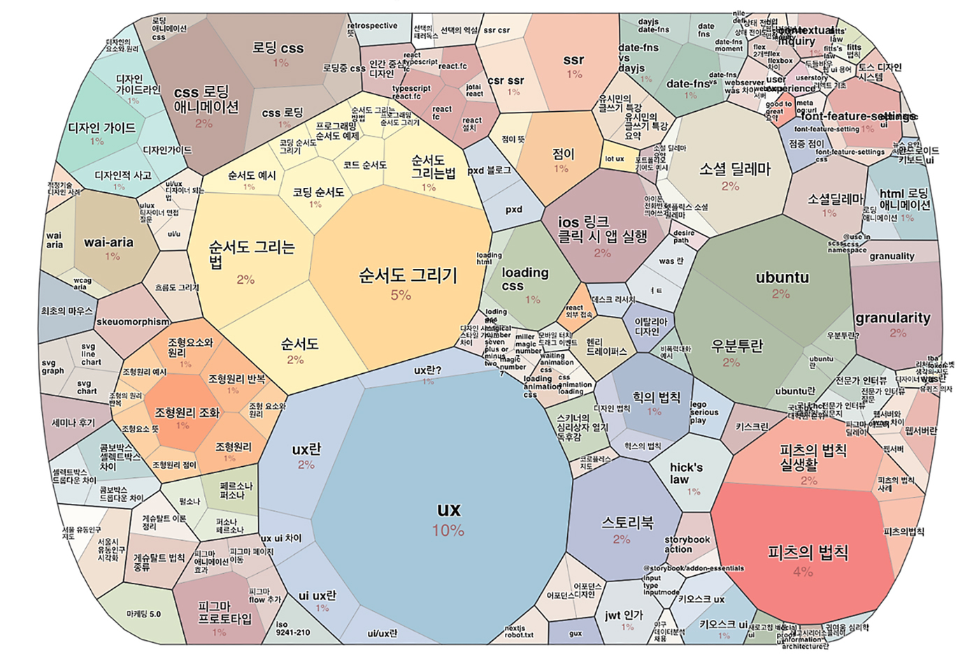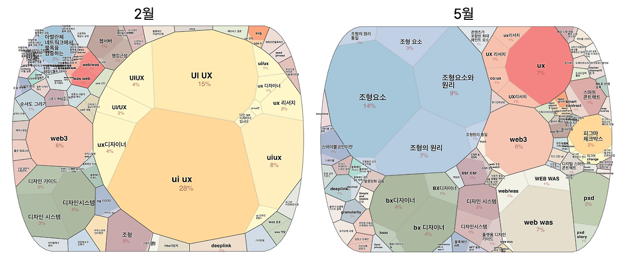 워드 버블로 시간에 따라 달라지는 키워드를 비교하면 트렌드에 맞춰 마케팅, 상품 전략 등을 세울 수 있습니다. 2월에 가장 비중이 컸던 ‘UIUX’가 5월에는 작아졌습니다. 해당 키워드 검색이 줄었다는 것이죠. 반면, ‘조형 요소와 원리’ 키워드로 유입된 사용자가 늘었습니다. 이는 학기 중이라 전체 사용자에서 학생들의 비중이 상대적으로 늘어나면서 디자인 분야의 중요 개념을 검색한 것으로 볼 수 있습니다.